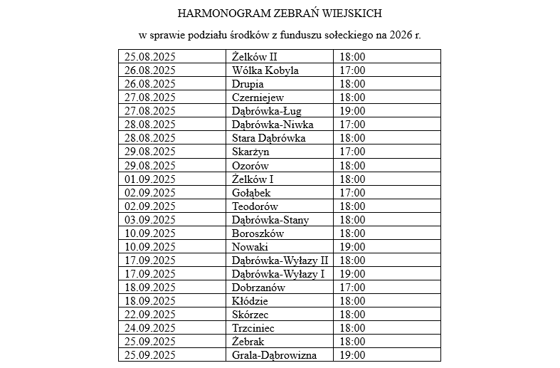 Józef Piłsudski Obchodzone 11 listopada Narodowe Święto Niepodległości jest polskim świętem państwowym upamiętniającym odzyskanie przez Polskę niepodległości w 1918 roku. Uwolnienie kraju z jarzma zaborców nastąpiło po 123. latach zniewolenia. 11 listopada 2025 r., w 107. rocznicę odzyskania niepodległości przez Polskę, uczczono w Skórcu pamięć tego wydarzenia. Uroczystość rozpoczęła się Mszą Świętą za Ojczyznę w kościele parafialnym w Skórcu. Licznie zebrani mieszkańcy gminy, strażacy, uczniowie spotkali się na skwerze przy Pomniku Niepodległości. Przy dźwiękach i strofach hymnu państwowego poczet wciągnął flagę na maszt. Do zebranych zwrócił się Wójt Gminy Skórzec – Jerzy Długosz, mówiąc: Bądźmy dumni z tego, że jesteśmy Polakami. Podczas dorocznych obchodów czcimy pamięć tych, którym zawdzięczamy własne państwo. Następnie został odczytany apel poległych, wspomniano w nim mieszkańców gminy i parafii, którzy poświęcili życie za wolną Polskę. Delegacje instytucji gminnych, samorządowych i społecznych złożyły kwiaty i wieńce przed pomnikiem. Tegoroczne obchody Narodowego Święta Niepodległości zorganizował i prowadził Arkadiusz Dołęga- dyrektor Gminnego Ośrodka Kultury w Skórcu. GALERIA ZDJĘĆ Urząd Marszałkowski Województwa Mazowieckiego w Warszawie Delegatura w Siedlcach ul. Wiszniewskiego 4, 08-110 Siedlce. Zaprasza przedsiębiorców, osoby prowadzące działalność wymagającą pozwoleń środowiskowych oraz przedstawiciel innych jednostek na jednodniowe, bezpłatne dot. opłat za korzystanie ze środowiska, opłat produktowych oraz rejestru podmiotów wprowadzających produkty, produkty w opakowaniach i gospodarujących odpadami (Rejestr BDO i baza BDO), organizowanym przez Departament Opłat Środowiskowych Urzędu Marszałkowskiego Województwa Mazowieckiego w Warszawie. W naszej gminie odbyła się uroczystość Złotych Godów, podczas której świętowali małżonkowie obchodzący 50. rocznicę zawarcia związku małżeńskiego. Pary, które pobrały się w latach 1973 i 1974: Wersja elektroniczna dostępna na naszej stronie internetowej. Wersja papierowa w Urzędzie Gminy, Gminnej Bibliotece Publicznej oraz placówkach handlowych na terenie gminy Skórzec. Szczepionka jest dopuszczona tylko do szczepienia lisów. Dla innych zwierząt nie posiada ukierunkowanego działania przeciwko wściekliźnie. Każdy przypadek zetknięcia się człowieka ze szczepionką należy zgłaszać służbie medycznej. Gmina Skórzec otrzymała dotację w kwocie 5 000 000,00 zł z Krajowego Planu Odbudowy i Zwiększania Odporności (KPO) na Uporządkowanie gospodarki wodno-ściekowej na terenie Gminy Skórzec i ogłosiła przetarg na Uporządkowanie gospodarki wodno-ściekowej na terenie gminy Skórzec: CZĘŚĆ NR 1 – Budowa sieci wodociągowej i sieci kanalizacji sanitarnej na CZĘŚĆ NR 2 – Budowa sieci wodociągowej i sieci kanalizacji sanitarnej na ul. Arcta w m. Dąbrówka-Stany CZĘŚĆ NR 3 – Budowa sieci wodociągowej i sieci kanalizacji sanitarnej na ul. Leśnej i ul. Kaleńskiej w m. Dąbrówka-Stany CZĘŚĆ NR 4 – Budowa sieci wodociągowej i sieci kanalizacji sanitarnej na CZĘŚĆ NR 5 – System teleinformatyczny TIK- wymiana wodomierzy w części miejscowości Skórzec wraz z montażem modułu radiowego, zakupem i uruchomieniem skanera radiowego, tabletu do odczytów i konfiguracji urządzeń pomiarowych, serwera bazodanowego, systemu zarządzania komunikacją, pakietu komunikacyjnego SMS z powiadomieniami oraz zakup i uruchomienie aplikacji mobilnej z oprogramowaniem. Dożynki, największe święto dla rolników, będące ukoronowaniem ich całorocznego trudu, obchodziliśmy w tym roku 31 sierpnia. Przy pięknej pogodzie mieszkańcy Gminy Skórzec dziękowali rolnikom za całoroczną pracę. Uroczystości rozpoczęły się Mszą Świętą dziękczynną w Sanktuarium Krzyża Świętego w Skórcu, którą odprawił ks. proboszcz Piotr Wojtyła. Podczas nabożeństwa pobłogosławił on wieńce i chleby dożynkowe. Po uroczystości kościelnej korowód dożynkowy udał się na plac przy domu parafialnym w Skórcu. Starostowie dożynek, państwo Agnieszka i Piotr Długoszowie, uroczyście przekazali na ręce Jerzego Długosza – Wójta Gminy Skórzec chleb z tegorocznego ziarna. Pan Jerzy Długosz w swoim wystąpieniu wyraził rolnikom słowa wdzięczności i uznania za codzienny trud i oddanie się pracy na roli. Rozstrzygnięto konkurs o nagrodę Starosty Siedleckiego, na „ Najładniejszy wieniec dożynkowy”. I miejsce zajęło– Koło Gospodyń Wiejskich z Gołąbka, II miejsce – KGW z Nowak, III miejsce – KGW z Dąbrówki-Niwki. Konkurs kulinarny, sponsorowany przez lokalnych producentów pieczarek firmy: Sopińscy – uprawa pieczarek i R&J Sztandera „Pieczarkowe inspiracje”, wygrało Koło Gospodyń Wiejskich z Dąbrówki -Stany, II miejsce – KGW z Żebraka, III miejsce – KGW z Gołąbka . W części artystycznej wystąpiły: zespoły: ,,Super Sześćdziesiątki”, ,,Żelki” ,,Albatros”, Aneta Karczmarska i Ryszard Boruc – recital. Uroczystość przygotował i prowadził dyrektor GOK -pan Arkadiusz Dołęga. GALERIA ZDJĘĆ Zmiana organizacji ruchu przy Zespole Szkolno-Przedszkolnym w Skórcu (ul. Siedlecka 1) od 1 września 2025 r. Informujemy o rozpoczęciu realizacji zadania pn. „Wykonanie Wielkoobszarowej Inwentaryzacji Stanu Lasu w Kraju w latach 2025-2029” prowadzonego w cyklu 5-letnim w lasach wszystkich form własności, w tym także w lasach niestanowiących własności Skarbu Państwa. W związku z realizacją inwestycji STAROSTWA POWIATOWEGO W SIEDLCACH pn.: „Przebudowa drogi powiatowej nr 3647 W Żeliszew Podkościelny – Wodynie na odcinku od m. Ozorów w kierunku m. Kłódzie ok. 995 m”, informujemy o wprowadzeniu czasowej organizacji ruchu na czas wykonania robót budowlanych od dnia 31 lipca 2025 r. (czwartek). zaprasza Koł