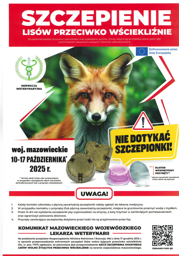 Powiatowy Inspektorat Weterynarii uprzejmie informuje, że w dniach 10-17 października 2025 r. na terenie powiatu siedleckiego przeprowadzona zostanie jesienna akcja szczepień ochronnych lisów wolno żyjących przeciwko wściekliźnie. Zrzuty oraz wyłożenie ręczne obejmą kompleksy leśne, pola, łąki z pominięciem akwenów wodnych, dróg i obszarów zabudowanych. Szczepionka umieszczona jest w przynęcie w postaci krążka. Lis podejmuje szczepionkę, która nie była dotknięta przez człowieka.