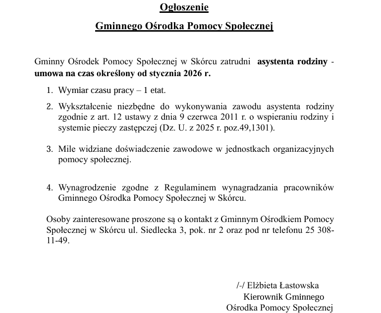 Ogłoszenie Gminnego Ośrodka Pomocy Społecznej