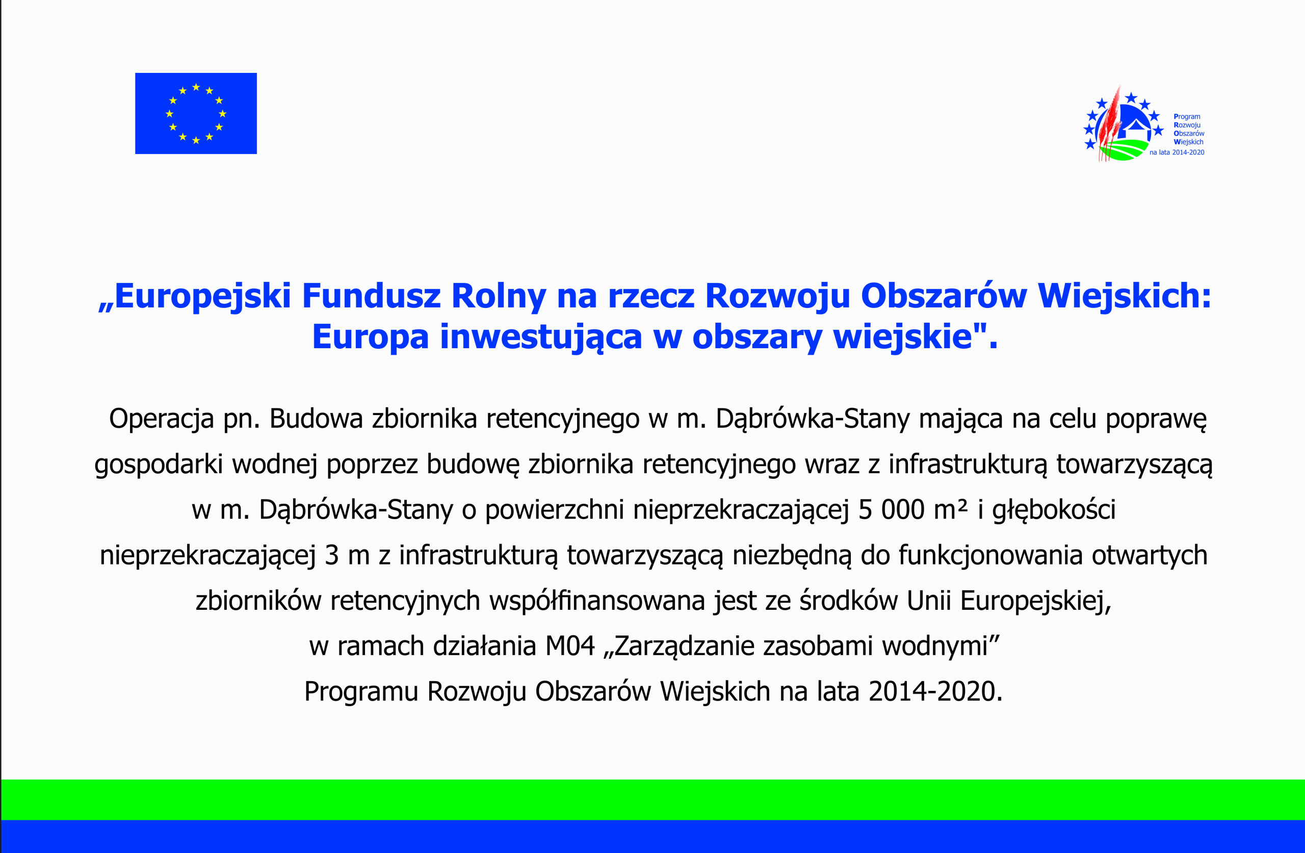 Cel główny projektu: Poprawa gospodarki wodnej poprzez budowę zbiornika retencyjnego w m. Dąbrówka-Stany.